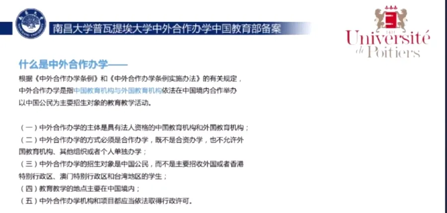 中外合作办学是中国的教育机构与外国的教育机构依法在中国境内合作举办的以中国公民为招生对象的教学活动。简单来说,就是国内高校和境外高校合作招生培养研究生。南昌大学中法项目在国内涉外监管网上有备案信息,包括招生人数等都可查询,这为学生提供了可靠的保障,让学生能够放心报考。