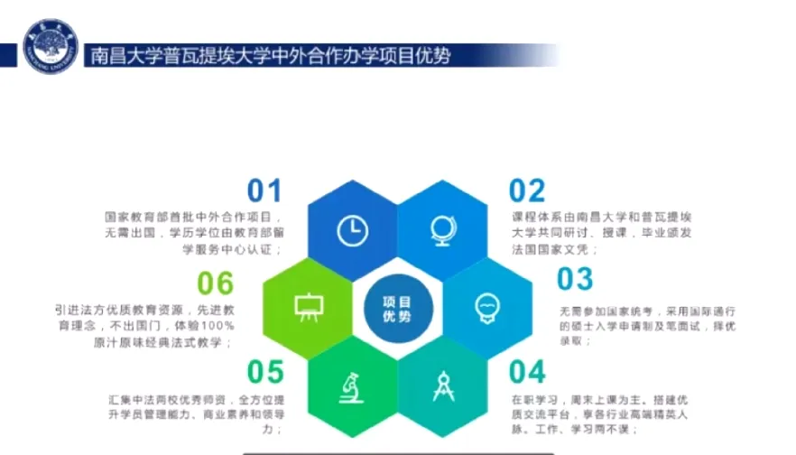 该项目具有诸多优势。它是国家教育部首批的中外合作项目,两年全程在国内上课,毕业之后直接可以做中留服认证,在疫情期间,对于想提升学历又不想出国的人来说是个很好的选择。课程体系由南昌大学和法国画家大学共同研讨授课,毕业颁发的是法国国家文凭,与在法国本校就读获得的学位证书一模一样。而且在职学习,周末上课为主,能为大家搭建优质的人脉平台,汇聚中法两校优秀师资,全方位提升学员的管理能力、商业素养和领导力,还能让学员不出国就体验到法式经典教育。