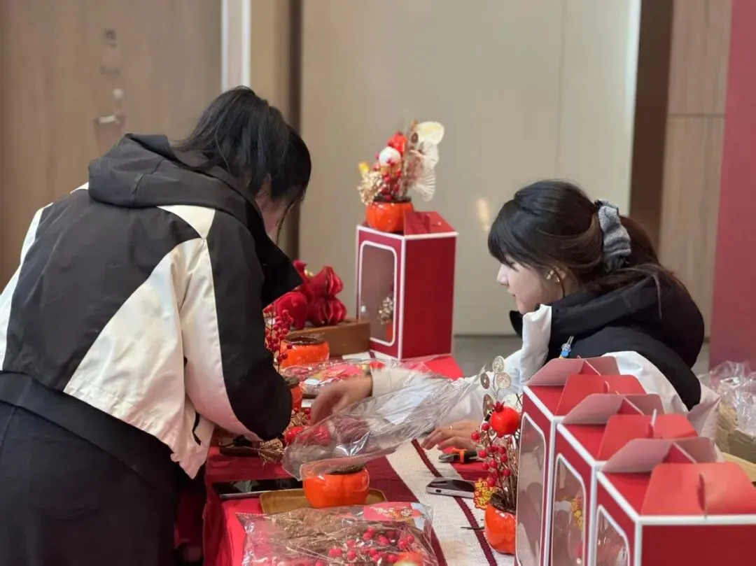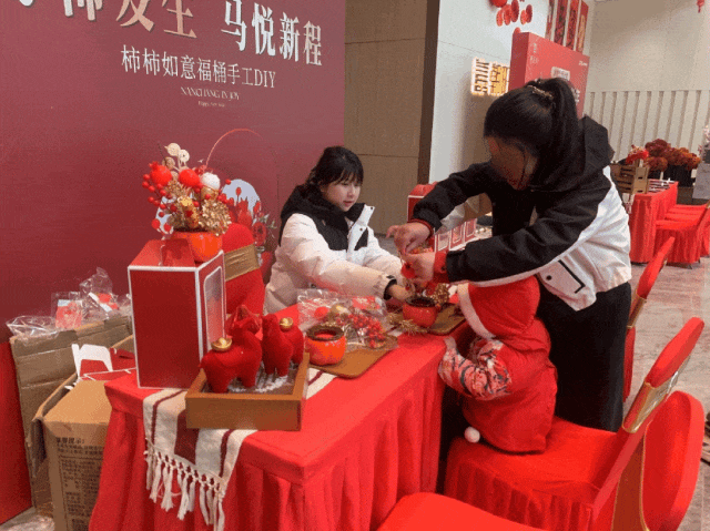 “柿柿如意”福桶DIY区,大家将一枚枚象征吉祥的火红柿子、金灿银杏与翠绿冬青,错落有致地插入福桶之中。每一份作品都承载着对新年“柿柿如意”的美好期盼。