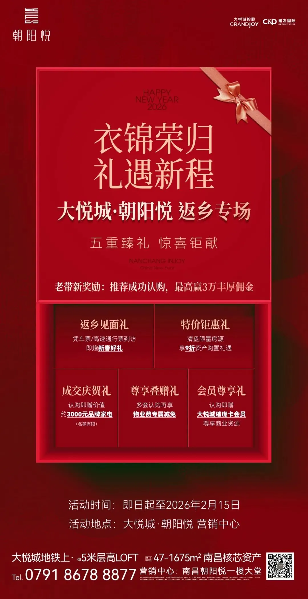 1.项目推广名:【大悦城·朝阳悦】,备案名:【大悦城2#服务型公寓】开发商名称:【南昌嘉悦房地产开发有限公司】预售证号:【(2024)洪行审房预售证第0111号】。本宣传资料所示内容(包括但不限于所有照片、模型、文字描述等)为要约邀请,不构成要约内容,具体信息以双方签订的合同约定及政府最终审批为准;2.部分素材、资料来源于网络,我方非相关图片的原创作者;3.因编辑需要文字与图片、视频、音频之间亦无必然联系,仅供读者参考;4.所有转载的图片、音频、视频文件等知识产权归该权利人所有,因非原创文章及图片等内容无法一一和版权者联系,如原作者或编辑认为作品不宜上网供大家浏览,或不应无偿使用,请及时通知我们,以迅速采取适当措施,避免给双方造成不必要的经济损失;5.本文如无意中侵犯了媒体或个人的知识产权,请联系我们,立即予以删除;6.本广告发布时间为2026年2月,有效期至2026年2月15日,出卖人不定期对宣传材料进行修改,敬请留意最新资料。