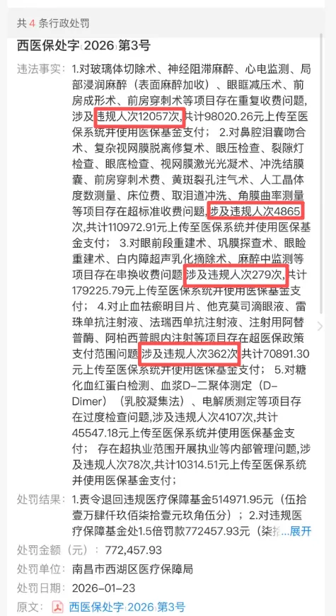 笔者通过企查查查询南昌爱尔眼科医院有限公司发现,2026年1月23日,南昌市西湖区医疗保障局做出西医保处字(2026)第3号对南昌爱尔眼科医院对违规医疗保障基金处1.5倍罚款772457.93元,责令退回违规医疗保障基金514971.95元。