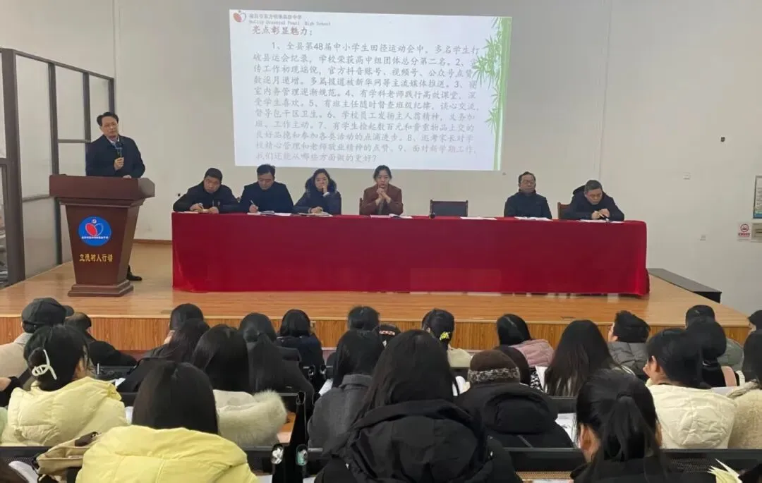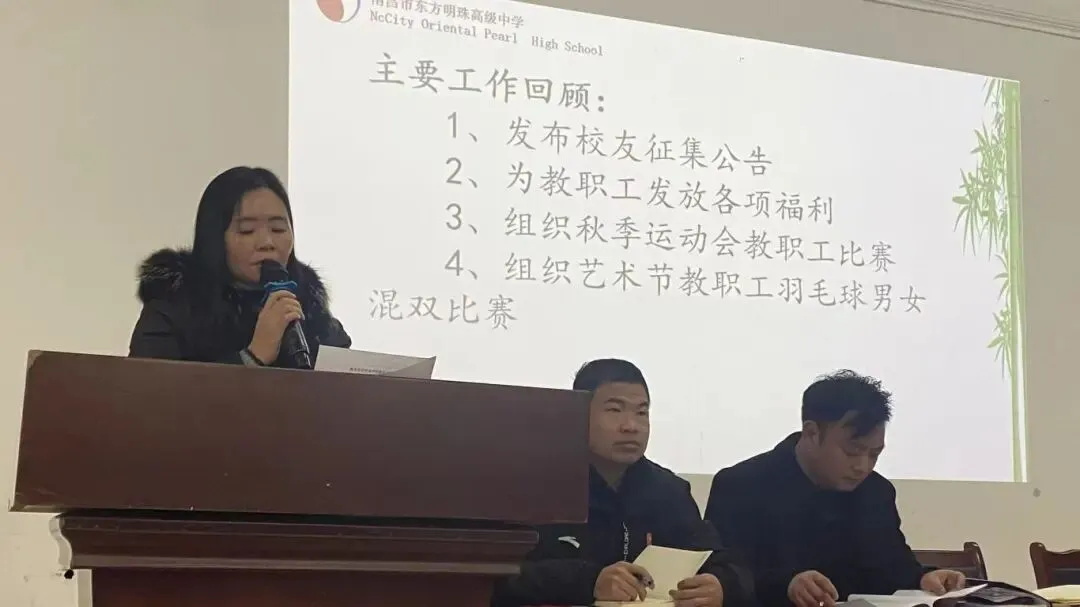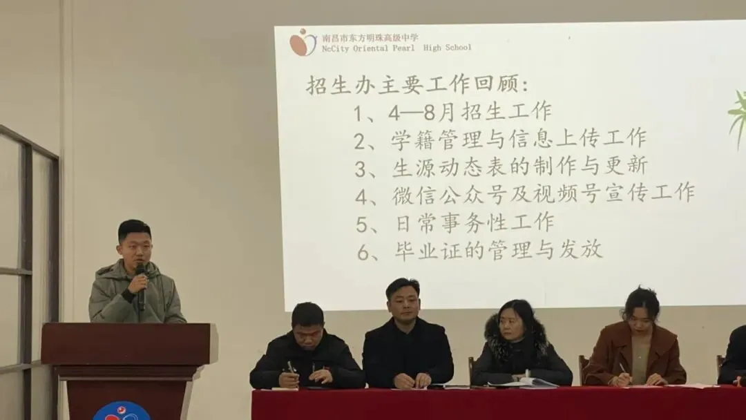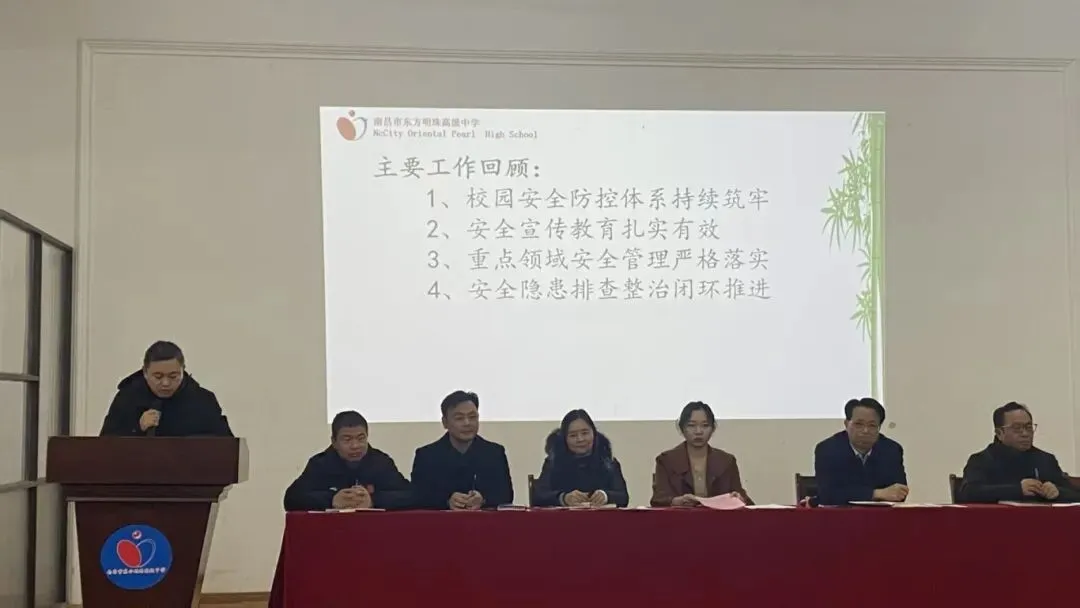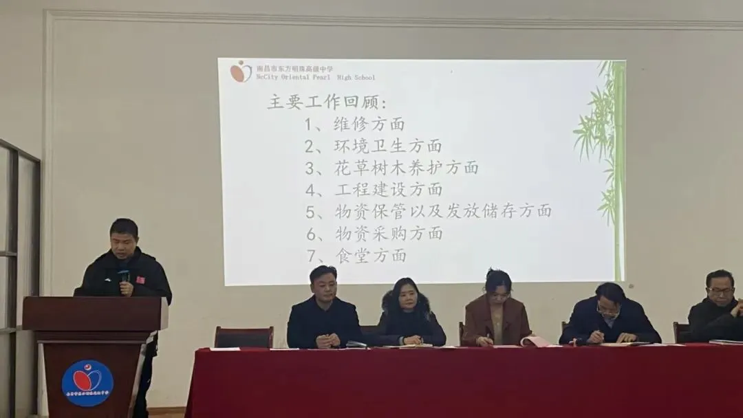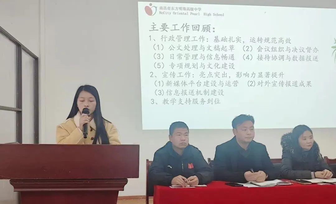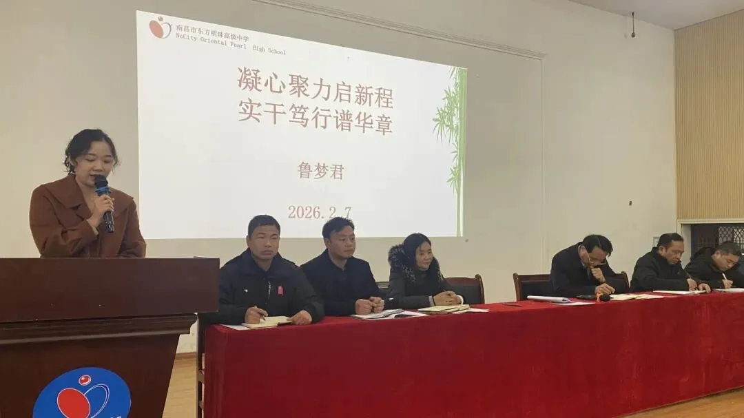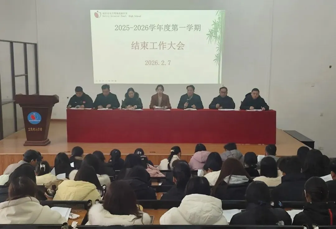 2月7日下午,南昌市东方明珠高级中学在阶梯教室隆重召开2025—2026学年度第一学期结束工作会议,总结和复盘上学期工作,部署下学期教育教学任务,动员广大教师凝聚奋进力量,实干笃行,坚守质量立校初心、彰显特色兴校担当、筑牢体艺强校根基、擦亮“东方明珠”名片,以万马奔腾之势喜迎马年新征程,奋力谱写明珠教育事业崭新华章。校党支部书记鲁梦君讲话,副校长谢才有主持会议。