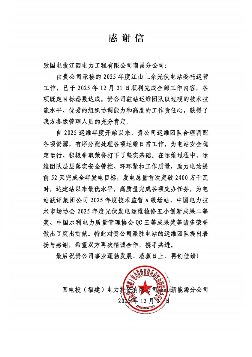 2月4日,南昌分公司收到一封来自湖北分公司的感谢信。信中对公司承接江山上余光伏电站日常运维工作,勇于面对困难挑战,全力以赴做好各项工作,顺利达成各项既定目标表示感谢。