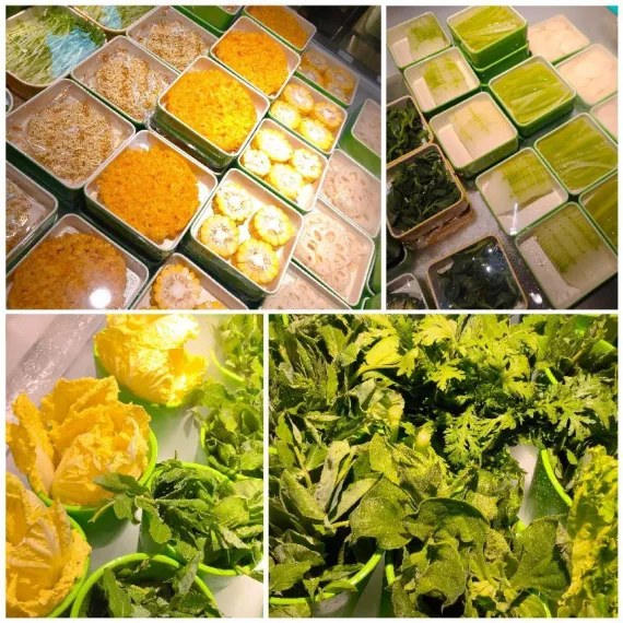 ☑素菜区种类超齐全,时令鲜蔬有娃娃菜、豌豆苗、生菜,脆嫩水灵,涮火锅几秒就能吃,清甜爽口。