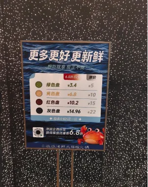 ☑ 透明计费:按盘子颜色区分价位,餐区清晰标注,消费明明白白不踩坑,添加企微好友,立享菜品6.8折专属券。