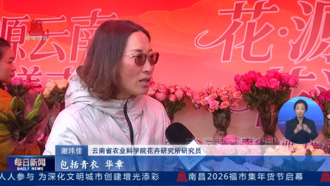 云南省农业科学院花卉研究所研究员谢玮佳:“这次带了我们的一些新品种,包括青衣、华章,这些月季的新品种,还带了一些大家比较少见的高山杜鹃,通过技术的人工花期调控,就让它提前开花了,这些新品种能给南昌的市民带来一个春天的气息,然后也让大家高高兴兴地过马年的新年。”