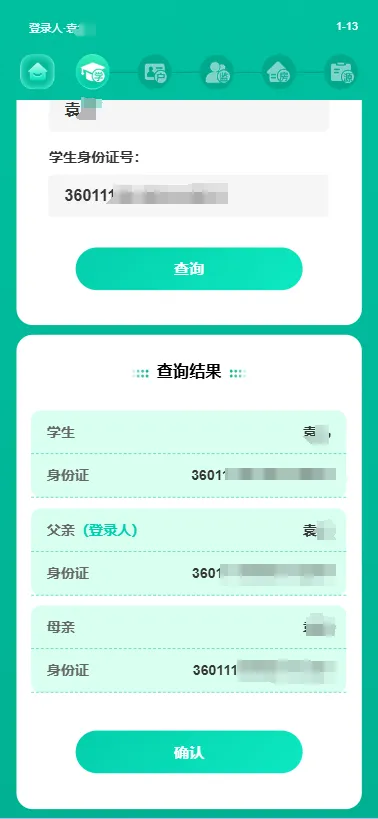 步骤说明:监护人输入学生姓名、身份证号点击“查询”,查询完成后可查看学生基本信息,核实信息无误后点击“确认”。