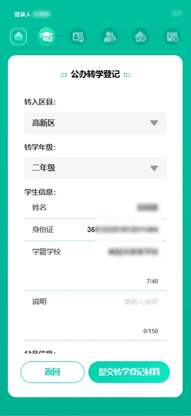 步骤说明:将另一位监护人的姓名和身份证输入后,再点击信息查询。显示“无法确定学籍,请补充转学材料。”,点击“提交转学申请”;