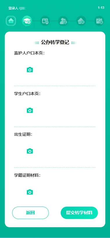 步骤说明:需如实填写转学信息,补充相关材料图片,完成后点击“提交转学材料”,等待审核。