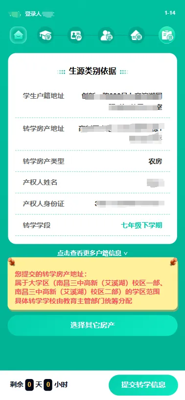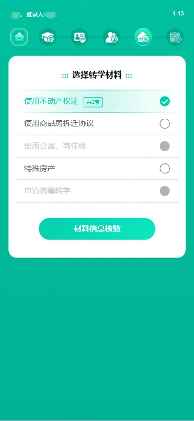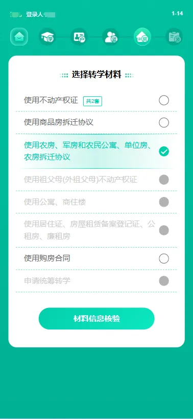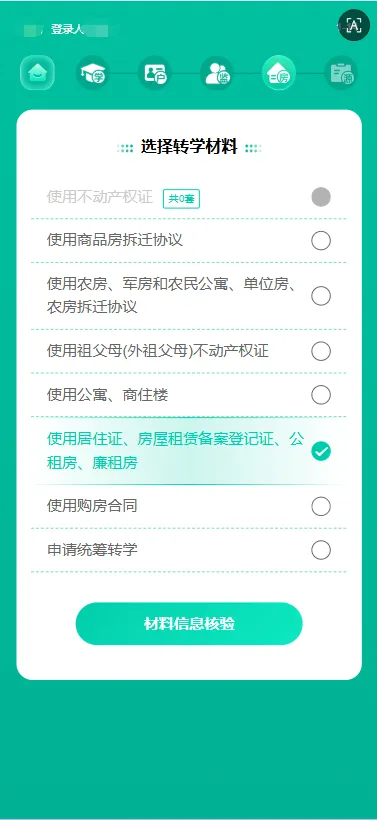 (1) 监护人在选择转学材料页面,选择“使用祖父母(外祖父母)不动产权证”。