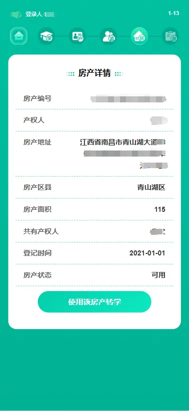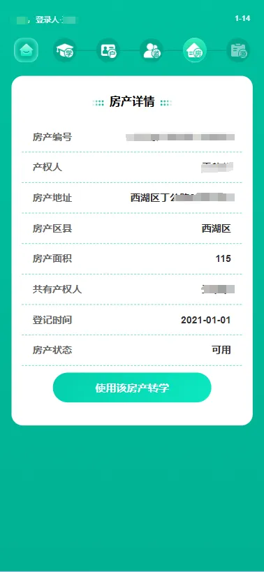 (2) 显示产权人名下房产列表,根据房产证号勾选需要使用的房产,点击“确认使用”,可查看该房产详情,核对无误后点击“使用该房产转学”。