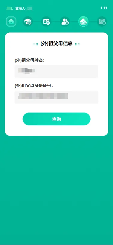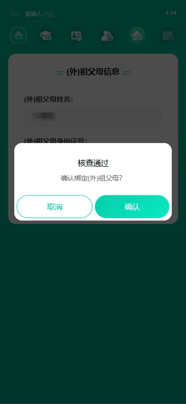 (2) 绑定祖父母(外祖父母)信息:填写祖父母(外祖父母)姓名、身份证号点击“查询”,核查祖父母(外祖父母)信息通过后点击“确认”。