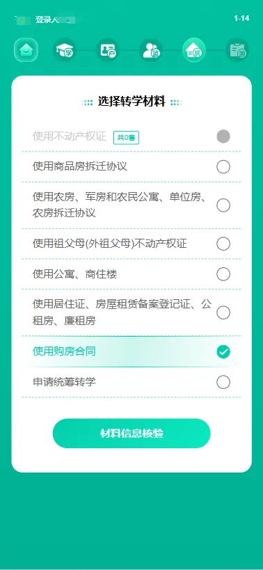 (1) 监护人在选择转学材料页面,选择“使用购房合同”