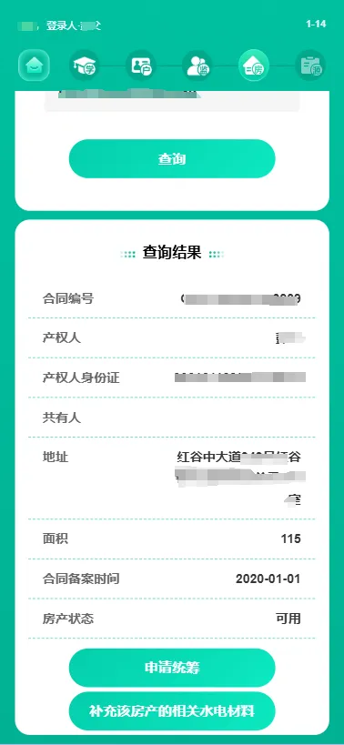 (2) 输入购房合同编号,点击“查询”,查看房产详情。点击“补充该房产的相关水电材料”。