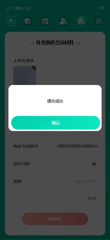 (3) 补充购房合同材料,上传相关材料,核对无误后点击“提交审核”;