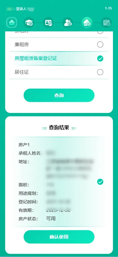 (2)转学房产类型选择“房屋租赁备案登记证”,点击查询。核对无误后点击“确认使用”。