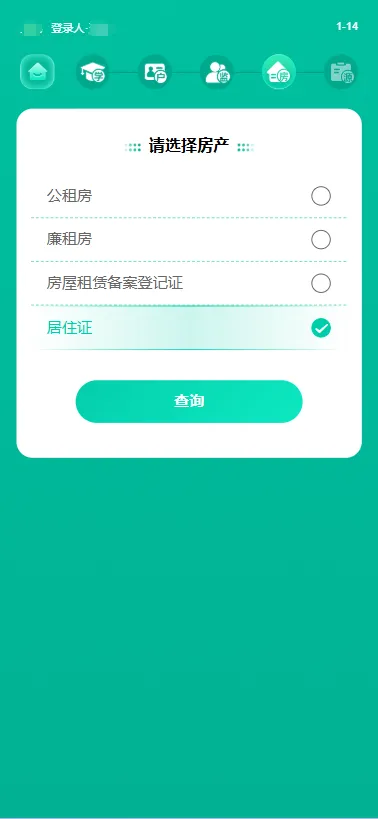 (2) 转学房产类型选择“居住证”,点击查询。核对无误后点击“确认使用”,可查看房产详情。核对无误后选择“使用该房产转学”。