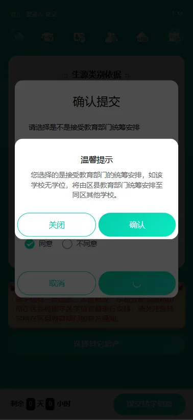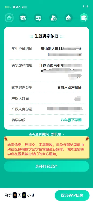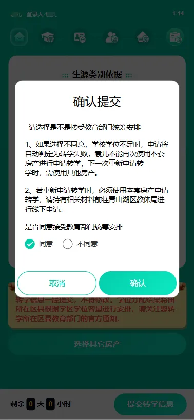 (1) 可查看生源类别依据及户籍信息,核对无误后,点击“提交转学信息”,仔细阅读重要提醒仔细考虑是否接受教育部门统筹安排,根据自己的意愿勾选“同意”或者“不同意”后点击“确认”;