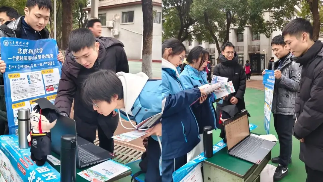 1月29日,闵喆良、金可桐、刘艺昕、李政扬四位同学组成的寒招小队,来到南昌二中苏圃路校区开展摆摊宣传。桌上的宣传资料被一抢而空,同学们围绕北科录取分数线、学科实力等问题踊跃提问,小队成员一一解答,现场氛围热烈。