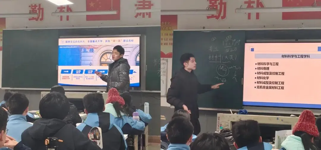 当晚,小队马不停蹄赶往南昌二中红谷滩校区,利用晚自习时间走进班级开展宣讲。闵喆良同学从专业设置、培养模式、录取分数等核心维度展开介绍,条理清晰地展现了北科的综合实力;李政扬同学作为大三学长则以材料专业为例,结合自身学习经历,生动解答了“材料专业学什么”“具体做什么”等大家关心的问题,用真实体验消除了同学们的困惑,让专业认知变得具体可感。