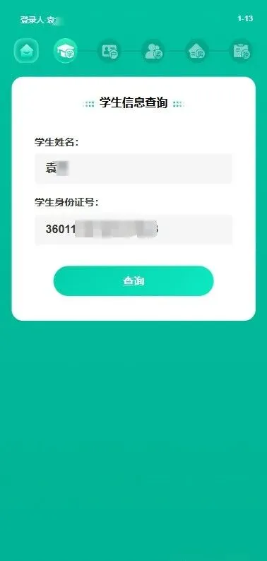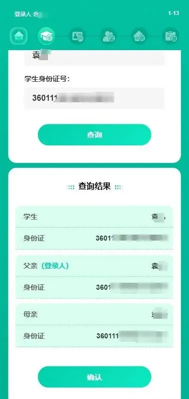 步骤说明:监护人输入学生姓名、身份证号点击“查询”,查询完成后可查看学生基本信息,核实信息无误后点击“确认”。