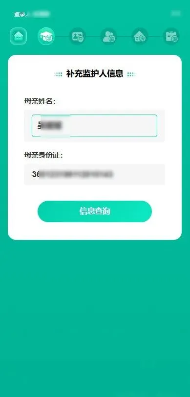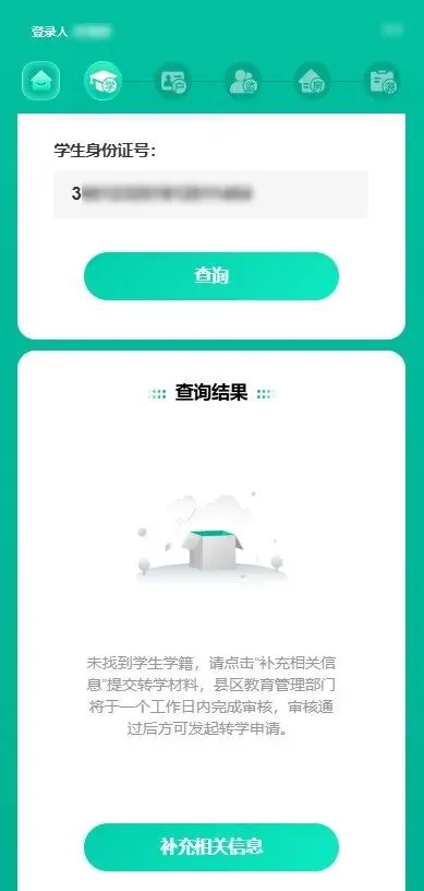 步骤说明:家长在登录后填写报名学生姓名及身份证信息,点击“查询”,查询显示“未找到学生学籍”,点击“补充相关信息”,继续补充监护人信息。