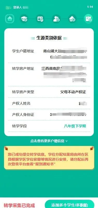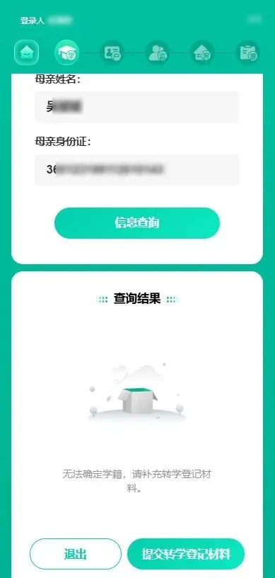 步骤说明:将另一位监护人的姓名和身份证输入后,再点击信息查询。显示“无法确定学籍,请补充转学材料。”,点击“提交转学申请”;