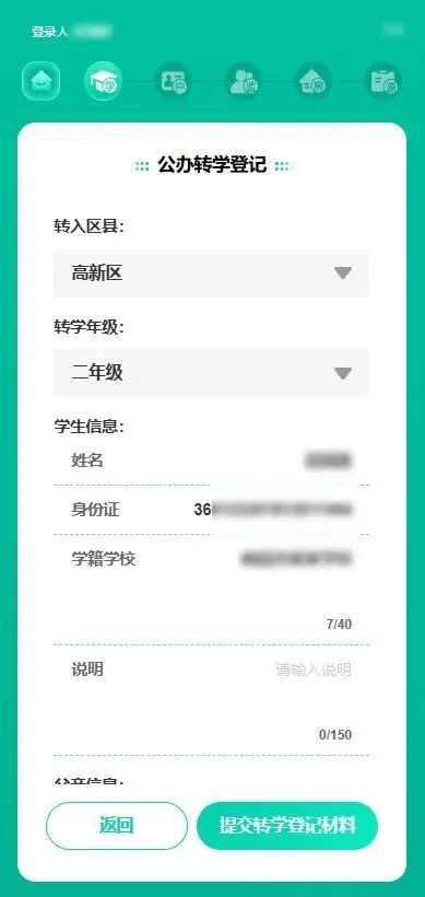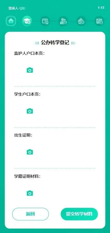步骤说明:需如实填写转学信息,补充相关材料图片,完成后点击“提交转学材料”,等待审核。