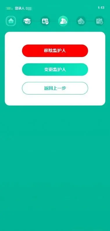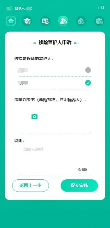 步骤说明:点击“移除监护人”,选择另一方,上传相关材料并点击“提交审核”。