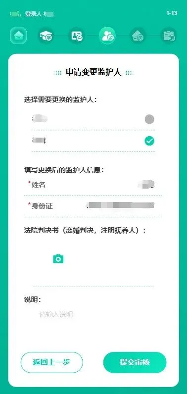 步骤说明:如需更换监护人,点击“更换监护人”,选择另一方监护人,填写更换后的监护人信息,上传相关材料,点击“提交审核”。
