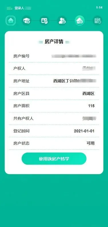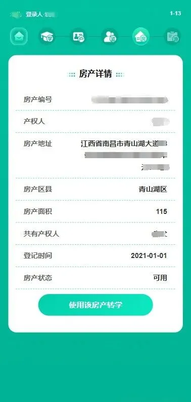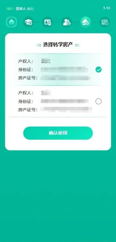 (2) 显示产权人名下房产列表,根据房产证号勾选需要使用的房产,点击“确认使用”,可查看该房产详情,核对无误后点击“使用该房产转学”。