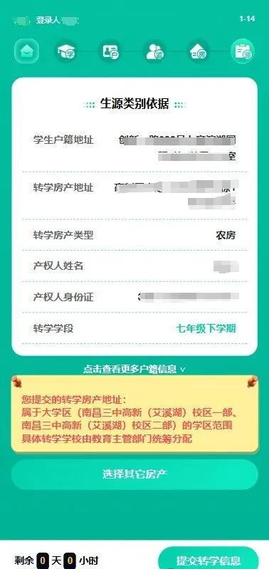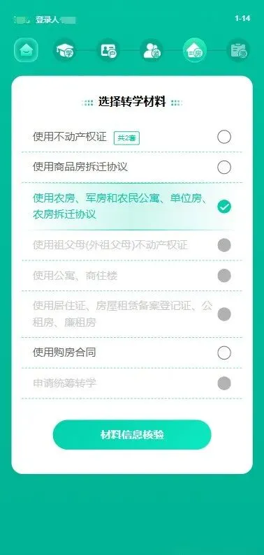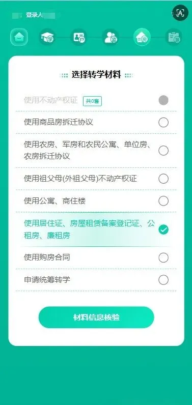 (1) 监护人在选择转学材料页面,选择“使用祖父母(外祖父母)不动产权证”。