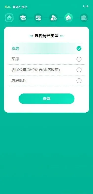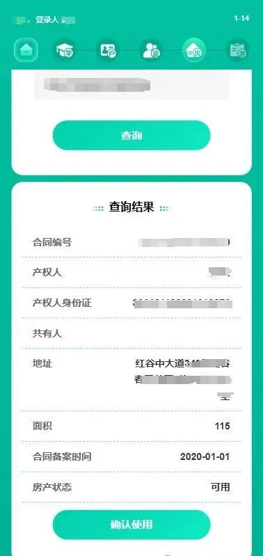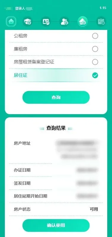 (2) 转学房产类型选择“农房”,点击“查询”。核对无误后点击“确认使用”。