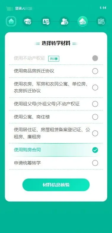 (1) 监护人在选择转学材料页面,选择“使用购房合同”
