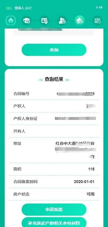 (2) 输入购房合同编号,点击“查询”,查看房产详情。点击“补充该房产的相关水电材料”。