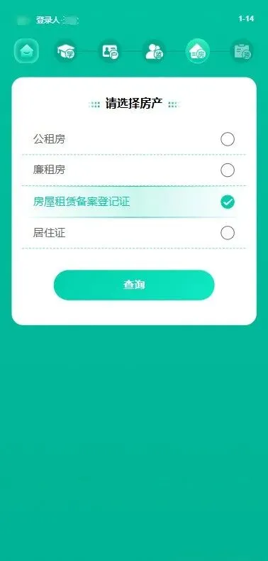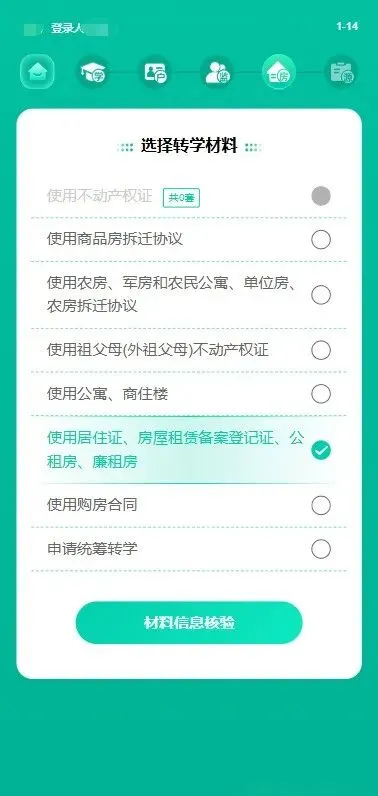 (1) 监护人在选择转学材料页面,选择“使用居住证、房屋租赁备案登记证、公租房、廉租房”。