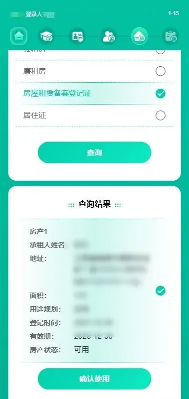(2)转学房产类型选择“房屋租赁备案登记证”,点击查询。核对无误后点击“确认使用”。