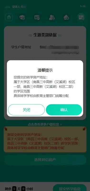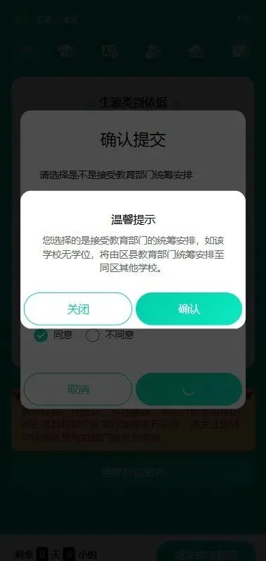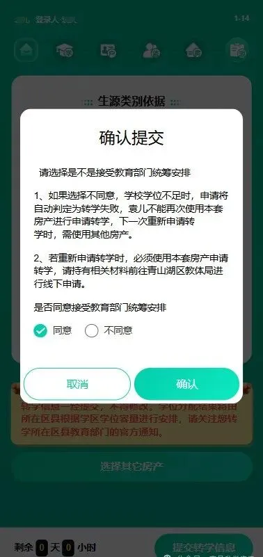 (1) 可查看生源类别依据及户籍信息,核对无误后,点击“提交转学信息”,仔细阅读重要提醒仔细考虑是否接受教育部门统筹安排,根据自己的意愿勾选“同意”或者“不同意”后点击“确认”;