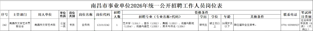 南昌市文学艺术院成立于1988年7月。前身为南昌市文学院,于1988年在市文学创作室的基础上组建成立的,为市文联下属全额拨款事业单位,副县(处)级,根据事业单位公开招聘有关规定,现将南昌市事业单位2026年统一公开招聘工作人员有关事项公告如下: