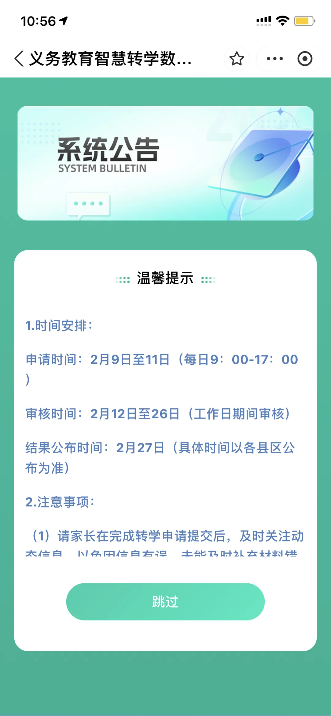 步骤说明:监护人(产权人)登录“昌通码”,点击“智慧转学”,进入“义务教育智慧转学平台”,选择“小学转学”或“初中转学”,查看公告通知,点击“跳过”。