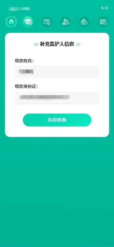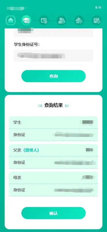 步骤说明:监护人输入学生姓名、身份证号点击“查询”,查询完成后可查看学生基本信息,核实信息无误后点击“确认”。