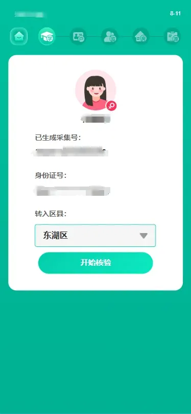 步骤说明:选择转入区县并确认(区县可进行切换),点击“开始核验”;