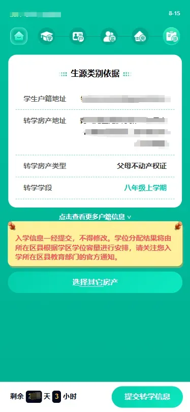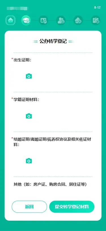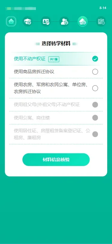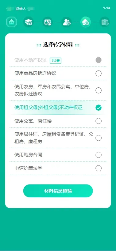 (1) 监护人在选择转学材料页面,选择“使用祖父母(外祖父母)不动产权证”。