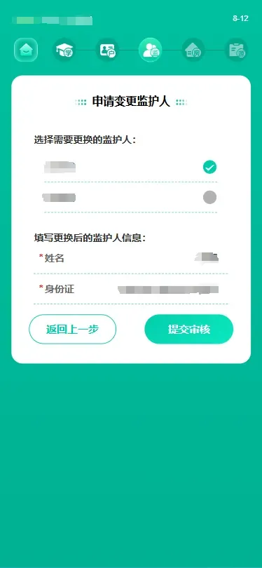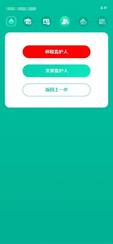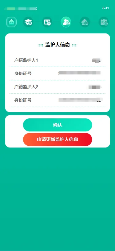 温馨提示:若监护人信息有异议可以点击“申请更新监护人信息”进行监护人“移除”或者“变更”。(详细操作步骤请参看“三、补充材料-移除、变更监护人)