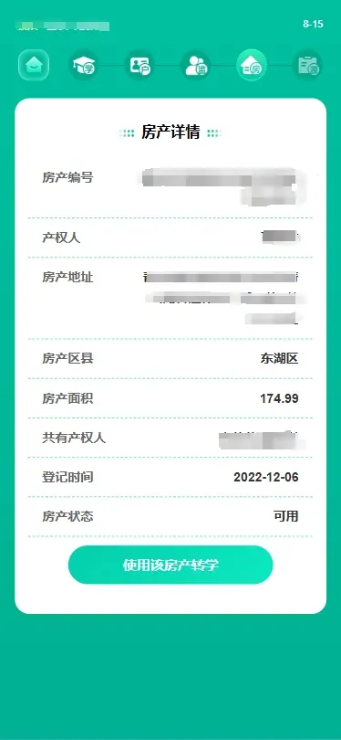 (3)绑定成功后,系统自动查询绑定的产权人房产信息。选择房产点击“确认使用”,查看房产详情。核对无误后选择“使用该房产转学”。