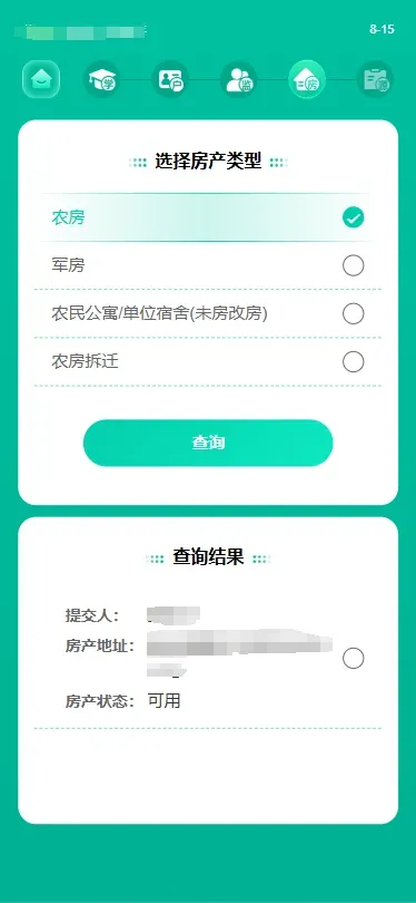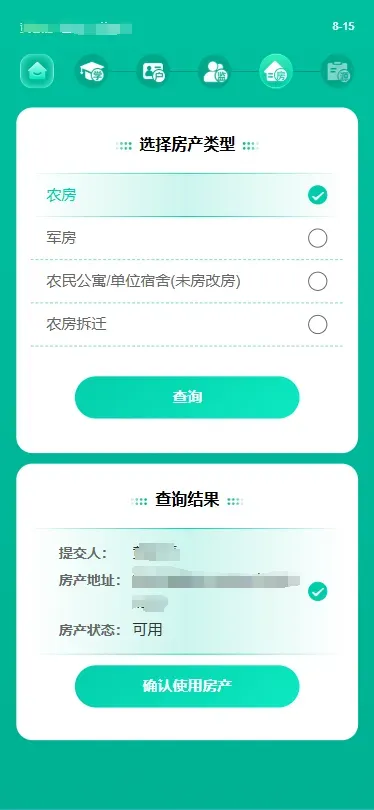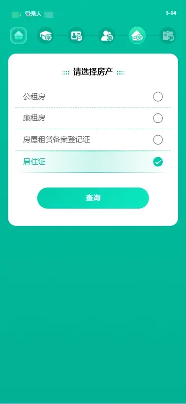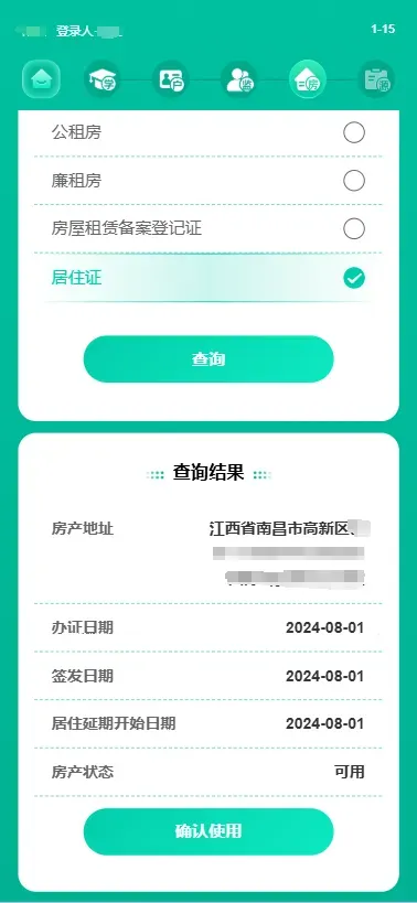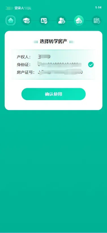(2)转学房产类型选择“居住证”,点击查询。核对无误后点击“确认使用”,可查看房产详情。核对无误后选择“使用该房产转学”。