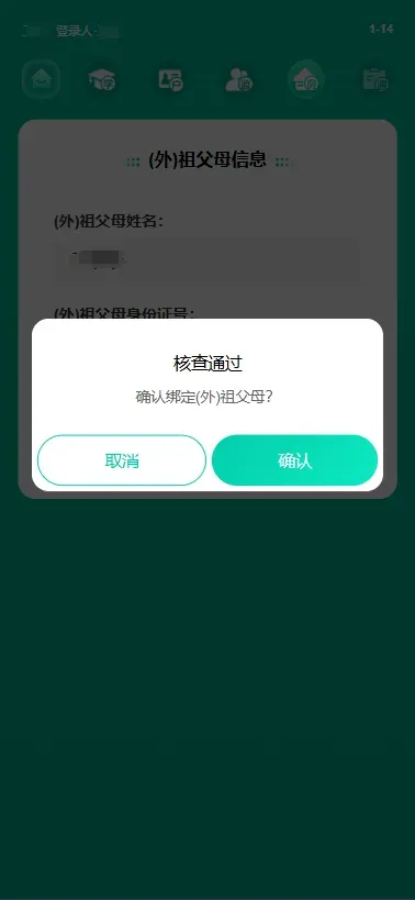 (2)绑定祖父母(外祖父母)信息:填写祖父母(外祖父母)姓名、身份证号点击“查询”,核查祖父母(外祖父母)信息通过后点击“确认”。