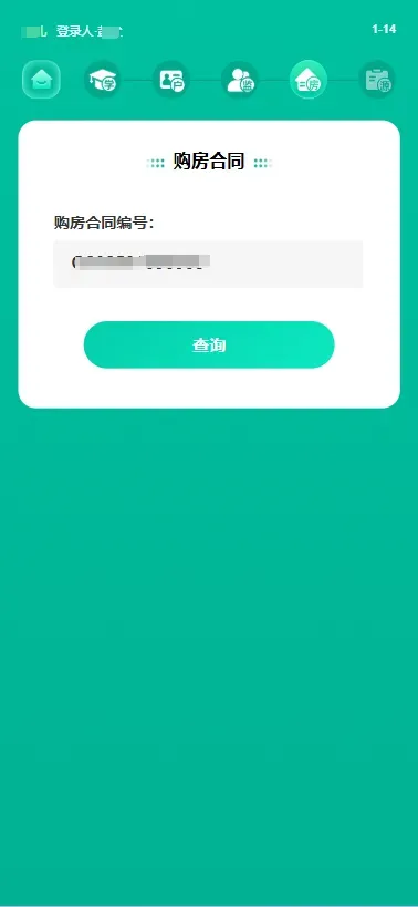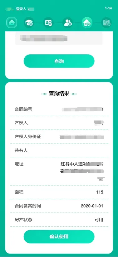 (4) 审核通过后在选择转学材料页面,选择“使用购房合同”,输入购房合同编号,点击“查询”,查看房产详情,核对无误后点击“确认使用”。
