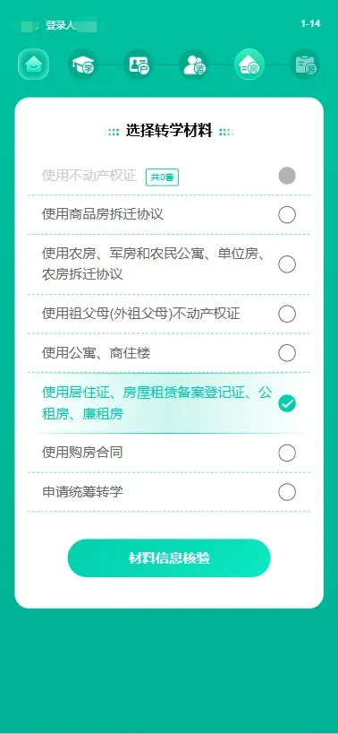 (1) 监护人在选择转学材料页面,选择“使用居住证、房屋租赁备案登记证、公租房、廉租房”。