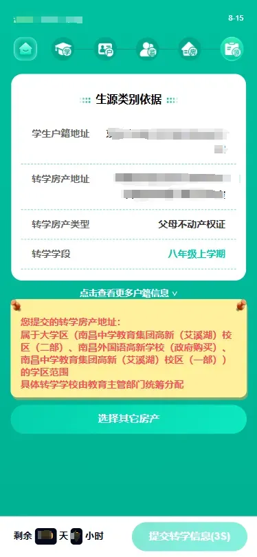 (1) 监护人在选择转学材料页面,选择“使用购房合同”